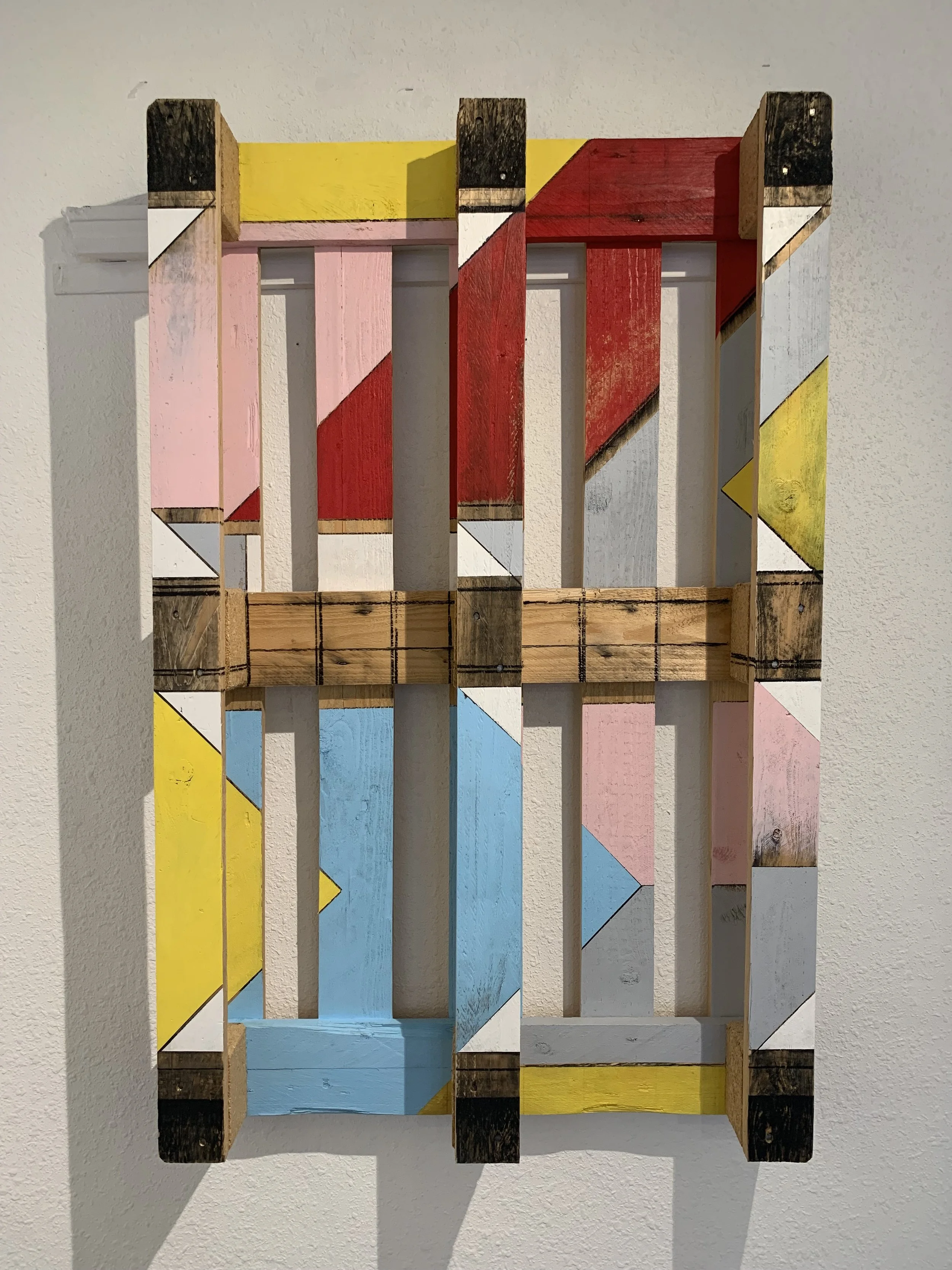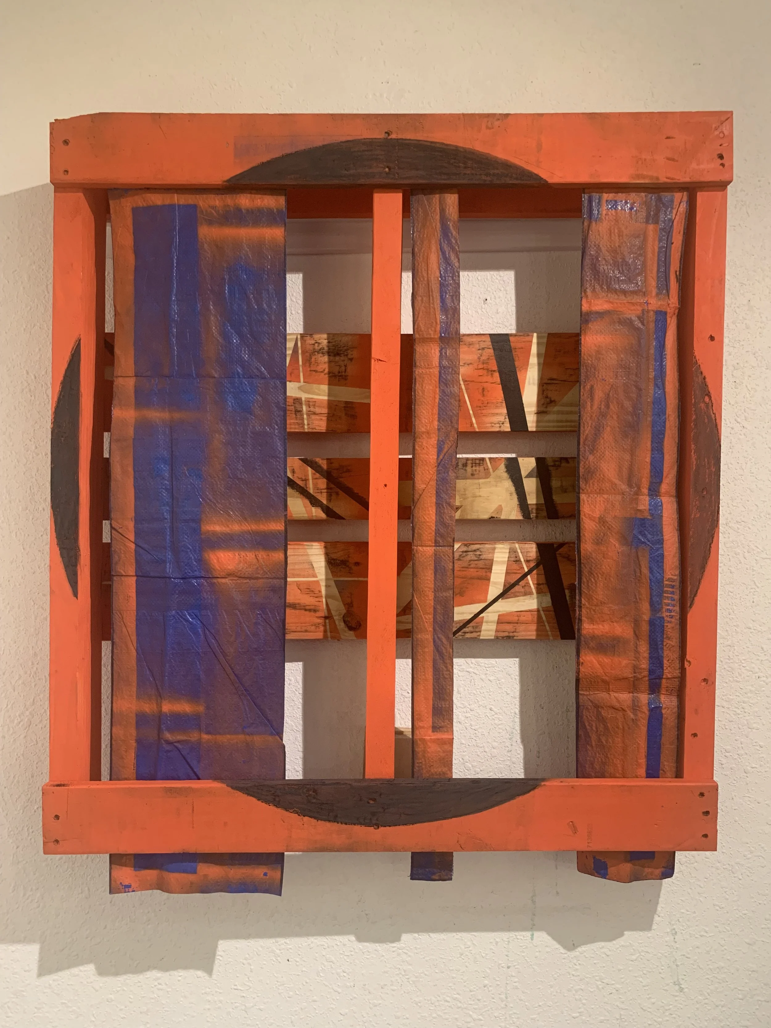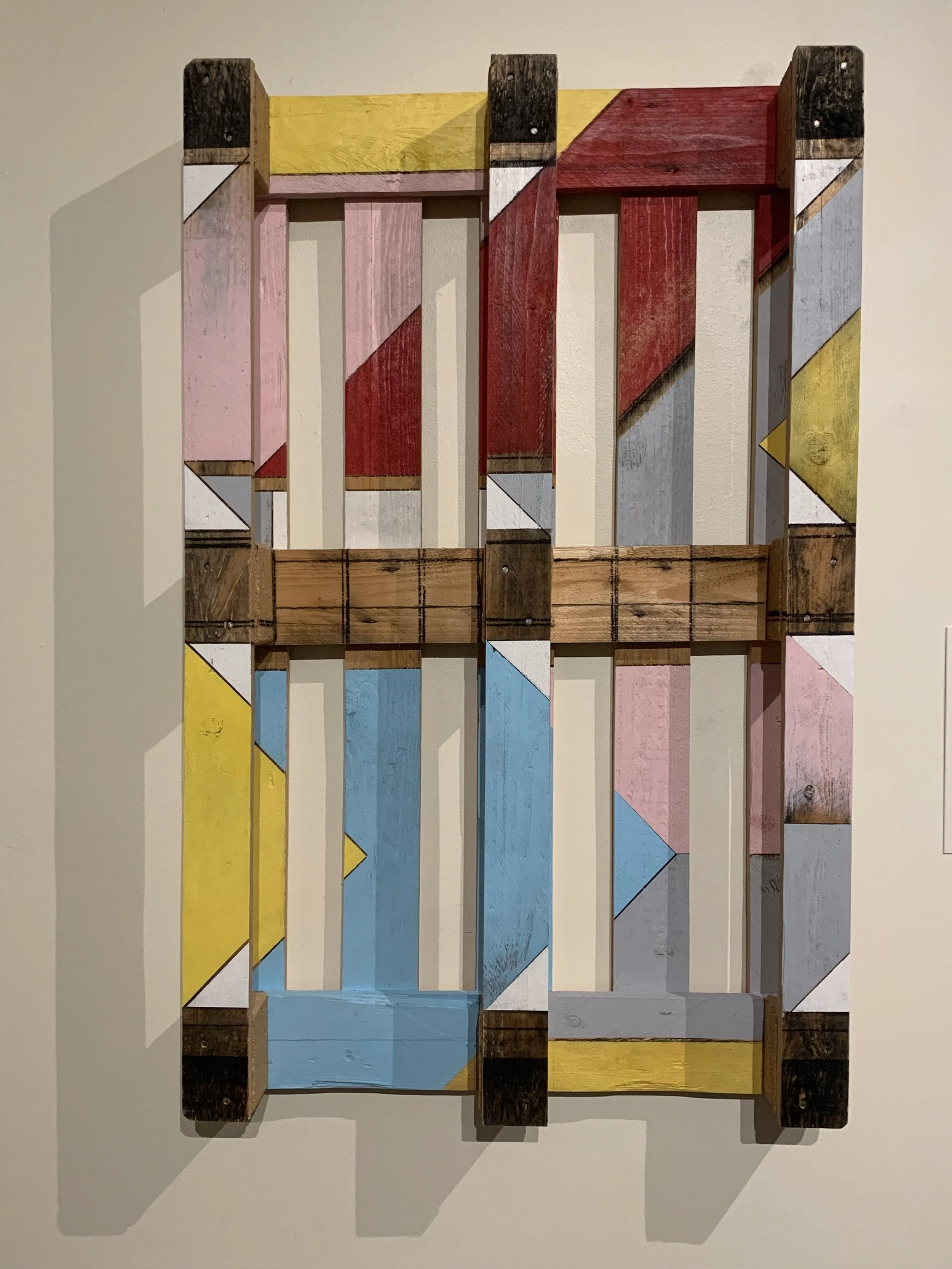 The "Pallet" series investigates many curiosities of painting, object making and testing boundaries. This budding project explores the search for an authentic substrate — an object that brings a previous history and sense of its own experience. Some of the self-imposed guidelines include no manipulation of the pallet other than basic sanding and prep. Then I react to them in their raw form, using an abstract approach to bring out their particular qualities. There is also an appeal for a 3-dimensional aspect to painting to explore the line between painting and sculpture or object making. I always believe that, in addition to current work, you must be laying the groundwork for future exploration. The desire to work on pallets has been in the making for about three years. This group represents my first step in this journey.