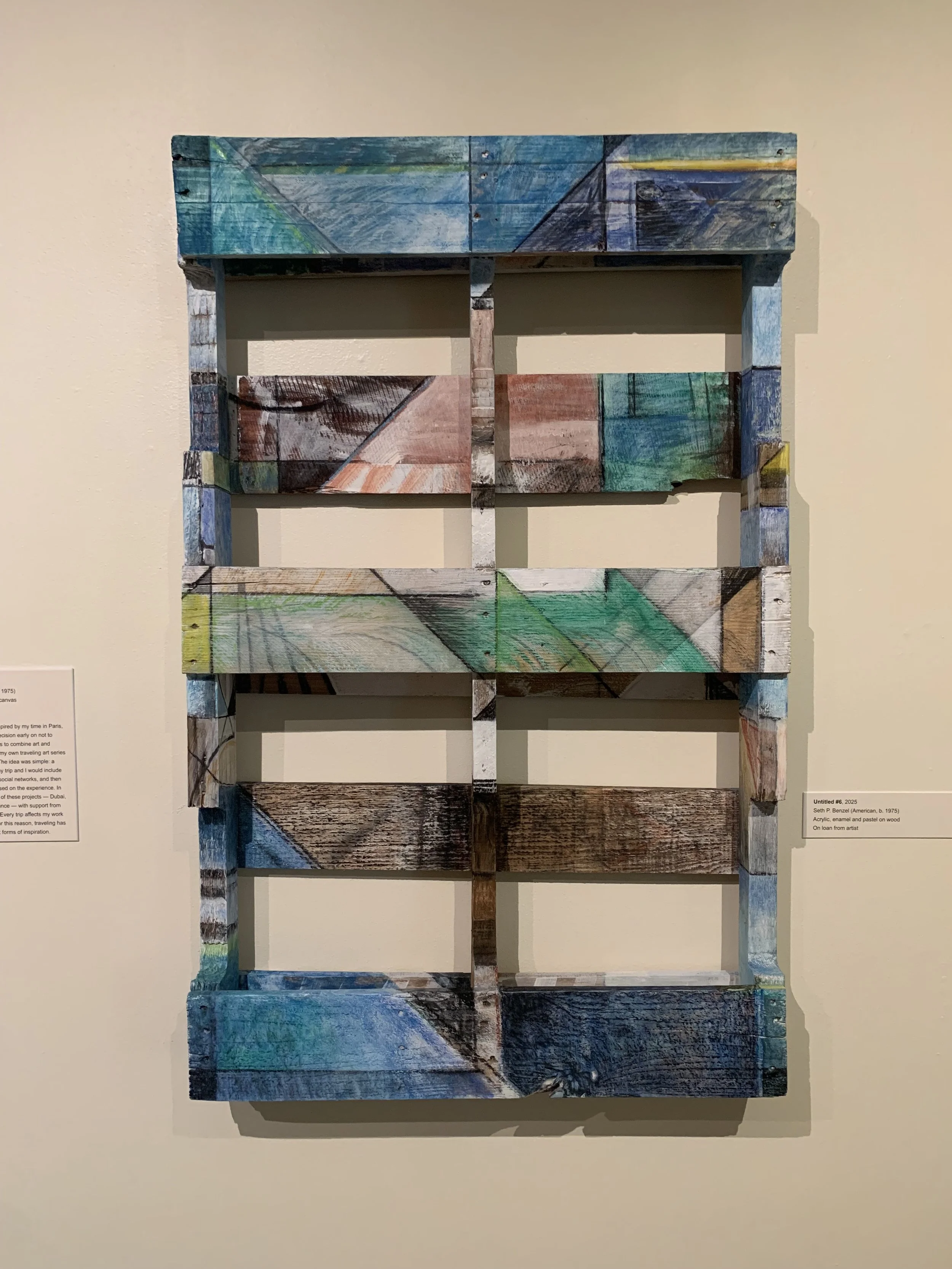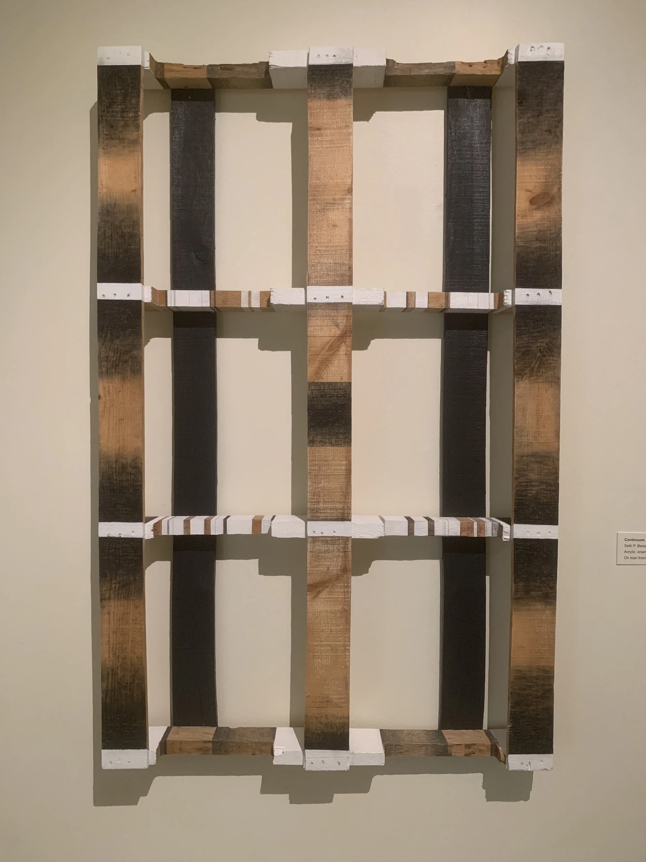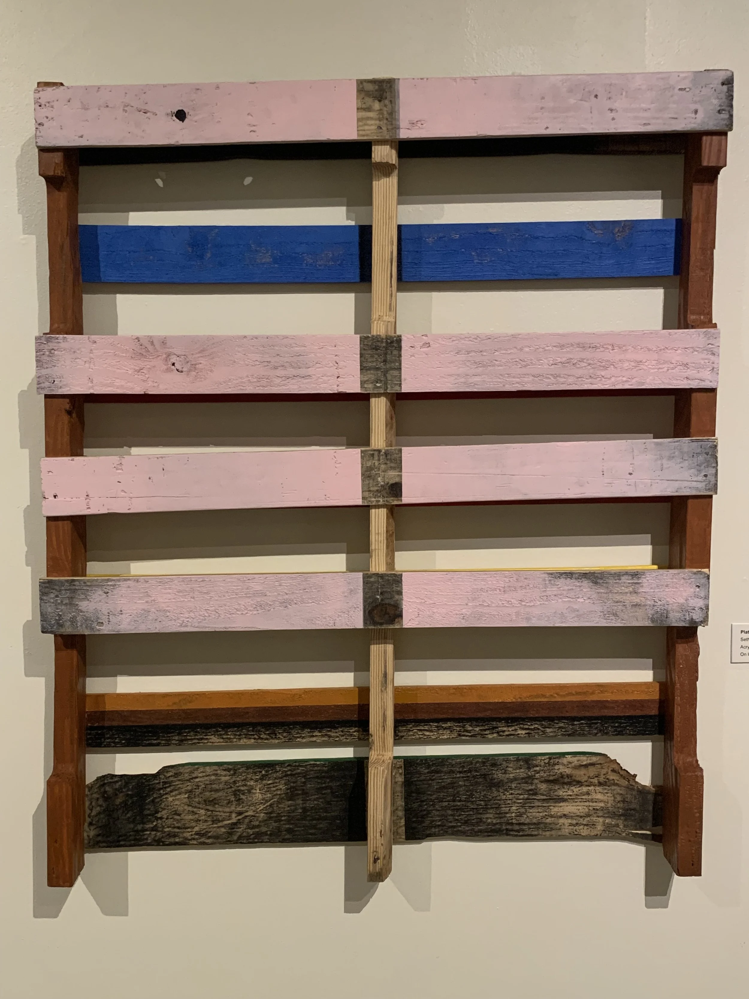 The "Pallet" series investigates many curiosities of painting, object making and testing boundaries. This budding project explores the search for an authentic substrate — an object that brings a previous history and sense of its own experience. Some of the self-imposed guidelines include no manipulation of the pallet other than basic sanding and prep. Then I react to them in their raw form, using an abstract approach to bring out their particular qualities. There is also an appeal for a 3-dimensional aspect to painting to explore the line between painting and sculpture or object making. I always believe that, in addition to current work, you must be laying the groundwork for future exploration. The desire to work on pallets has been in the making for about three years. This group represents my first step in this journey.